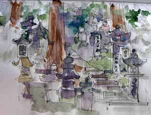 Mt. Koya is the home of Shingon Buddhism and a number of temples there provide lodging. Stayed at Eko-in (left), a temple with origins stretching back more than 1,000 years. After the evening vegetarian meal, slept on a futon laid out on the tatami floor by a young monk apprentice, and was sketching by 6am, before attending the morning chants and goma fire ceremony. Sketched after that too - to avoid breakfast, I must admit. Miso soup at 7am just doesn't do it for me and I didn't want to be rude.. Cream buns from the bakery do. (Arigato, Junko-san and Noriko-san.) There are several things to see at Koyasan, including Kongobuji Temple with its huge rock garden and excellent painted sliding screens -- and where they serve you tea on a red carpet. A nice timeout on a cold rainy spring day. But for me, the highlight was Okunoin and a path stretching more than a half kilometer through a dense forest of cedars, green moss (and rain on this day), lined with more than 200,000 tombs and monuments, erected by faithful followers through the centuries who wanted to be near Kobo Daishi -- whose mausoleum lies at the end of the pathway -- when he awakens. Note: women were barred from entering the sacred grounds of Mt. Koya until 1872. |